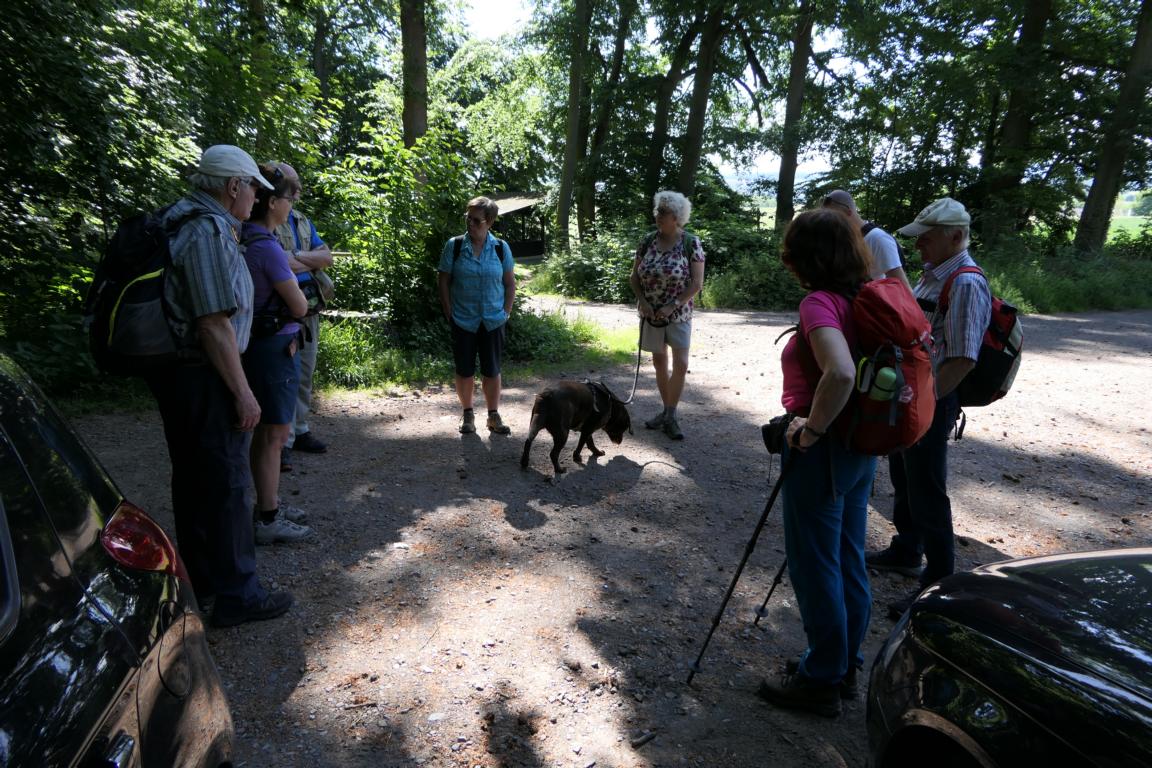 Neun Wanderfreunde und ein Hund begannen die Wanderung der A-Gruppe auf der 8 Kilometer langen Strecke nach Darmstadt. Erste geschichtliche Hintergründe zur Namensgebung des Wanderparkplatzes Kuhfalltor gab es schon vor dem Start der Wanderung. Nach 500 Metern machten wir am Großherzoglichen Jagd-Pavillon und der Ludwigs-Eiche halt. Danach ging es auf dem Kotelettpfad Richtung Darmstadt